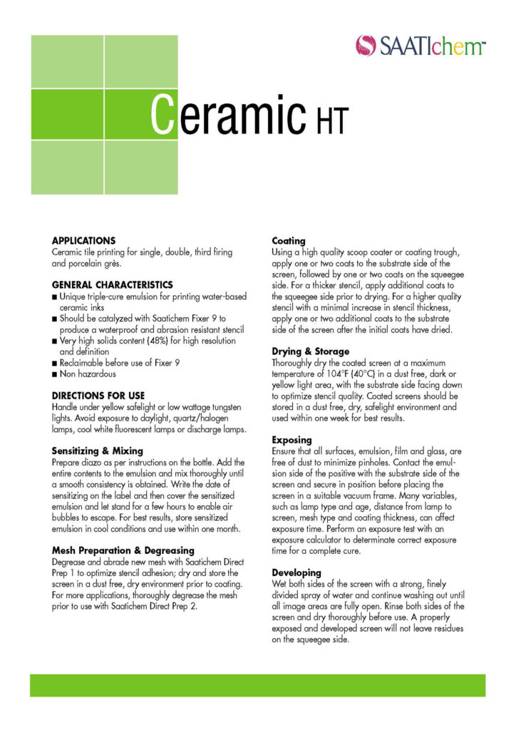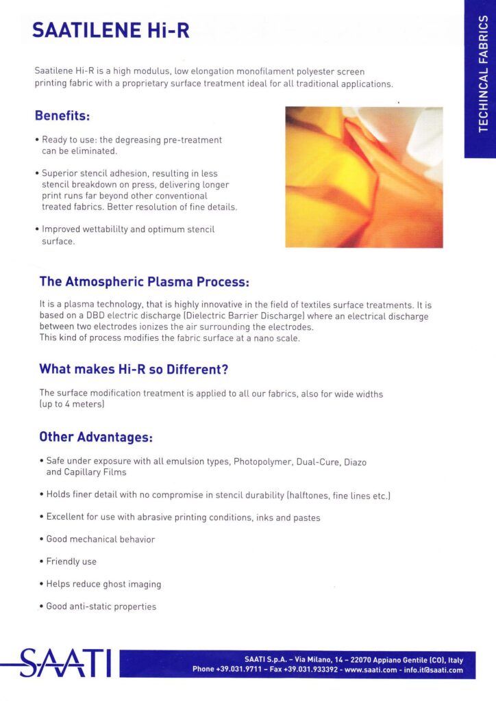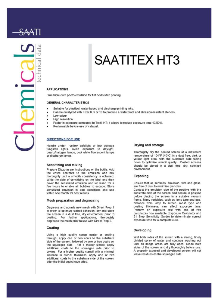 ผลิตภัณฑ์ SAATItex มีอิมัลชันแบบ โฟโตโพลิเมอร์แบบบริสุทธิ์ (pure photopolymer), อิมัลชันที่มีส่วนประสมของไดเอโซ (diazo-based) และ อิมัลชันแบบผสม (hybrid emulsions) ซึ่งทำให้รองรับ และใช้ได้กับกระบวนการพิมพ์ทุกประเภท รวมไปถึงการพิมพ์กริตเตอร์แบบพิเศษ และงานพิมพ์ที่ใช้ความหนาแน่นสูง ด้วยลักษณะทางเคมีที่เป็นนวัตกรรมใหม่ช่วยให้มั่นใจได้ว่าเป็นอิมัลชัน (emulsions)ที่เหมาะสําหรับหมึกทุกประเภทไม่ว่าจะเป็นแบบน้ํา (water-based), ดิสเพิร์ส (dispersed), กรด (acid), แบบกัดกร่อน (corrosive), พลาสติกโซล (plastisol), โซลเว้นท์ผสม (co-solvents), and ซิลิโคน (silicone) ที่ใช้ในการพิมพ์ที่มีความหนาแน่นสูง บางสินค้าสามารถใช้ได้กับหมึกพิมพ์ทุกชนิดด้วยเช่นกัน ผลิตภัณฑ์ SAATI’s textile emulsion ยังเหมาะกับสินค้าที่ใช้เทคโนโลยีการพิมพ์ระบบ computer-to-screen (CTS) นิยมใช้อย่างมากในอุตสาหกรรม การพิมพ์ผ้า งานกระจก และเซรามิก